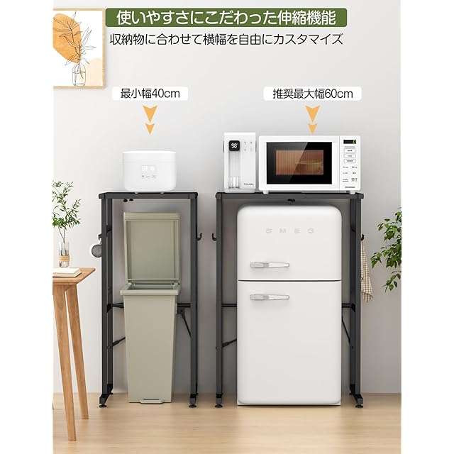 Holdm ゴミ箱上ラック レンジラック スチール 伸縮 40-60×奥行40×高さ86.5cm 耐荷重25㎏ フック8個付 アジャスター付き レンジ台ラック 冷蔵庫上ラック (ブラック)