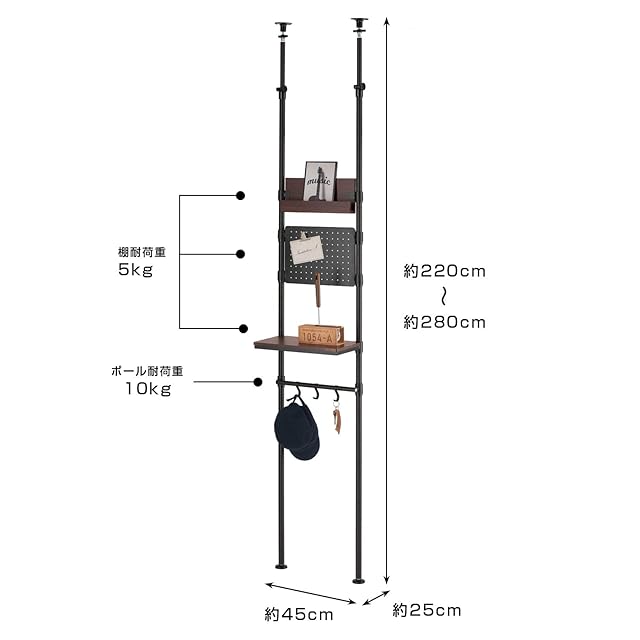 ドウシシャ ルミナス ノワール 突っ張り ラック つっぱり 棚 幅40 壁面収納 ウォールラック 簡単取付 段差対応 有孔ボード S字フック付き 穴あけ不要 壁を傷つけない 木製棚板 スリム 黒 ブラック 全体耐荷重25kg NO40-T