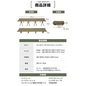 【その他のスペック】 地面の凸凹に左右されない:フィールドの状態に左右されず、どんな場所でも、リラックスしたひと時を堪能してください。 ハイ・ローどちらでも使用可能:コットをハイスタイル・ロースタイルの2つの高さに調節することが可能です。お好みの高さ、テントの大きさに合わせたスタイルでお楽しみいただけます。 大きめの収納袋:ゆとりのある設計のためストレスなく収納することが可能です。車での積載、持ち運びがしやすいサイズ感なのも特徴です。