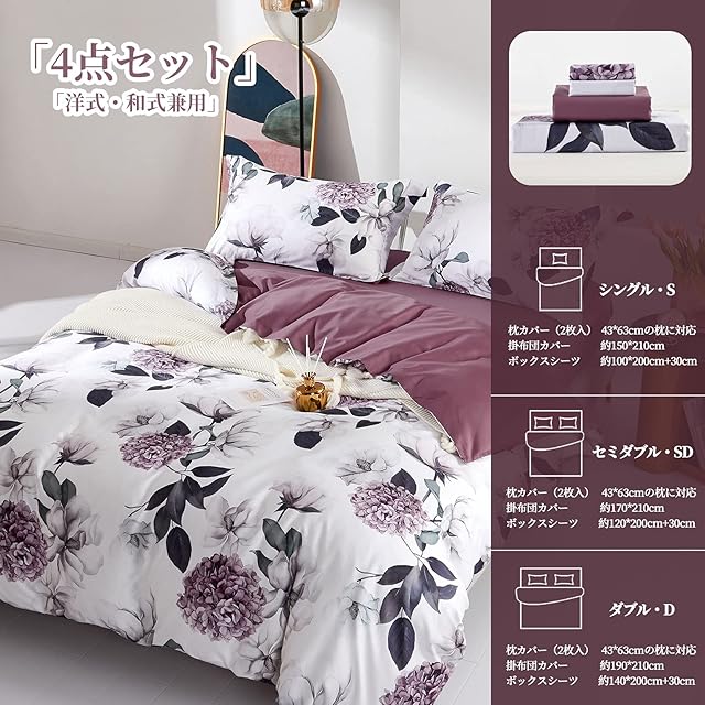 【ふとんカバーセット 4点セット シングル】枕カバーx2点:約43 x 63cm丨掛け布団カバー:約150 x 210cm丨ボックスシーツ:約100 x 200cm+30cm(マットの厚み10~30cmに対応)