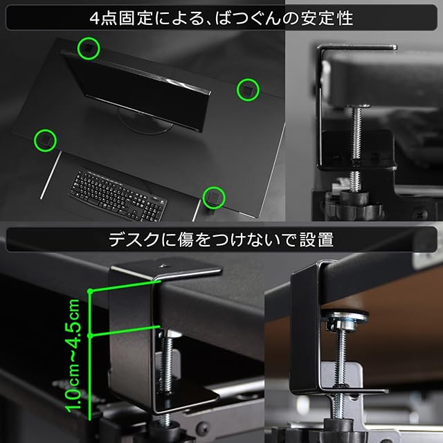 【デスクに傷をつけないで設置可能】 デスクを挟み込むタイプのクランプ式を採用しているため、デスクにネジ穴を空けずに固定可能