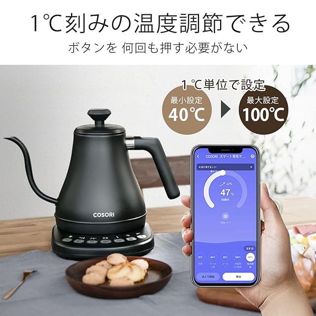 スマホ対応機種 COSORI(コソリ) スマート電気ケトル コーヒーケトル 0.8L 保温付き 自動電源オフ 空焚き防止 ドリップケトル おしゃれ 小型 ケトル 細口 電子ケトル CS108-NK ブラック