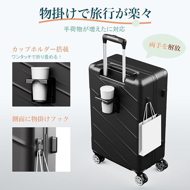 【折りたたみ式カップホルダー付き&隠しフック機能】このスーツケースの後部には便利なカップホルダーが付いており、旅行途中に買った飲み物や折りたたみ傘も収納可能です。さらに、隠しフック機能が搭載されており、カバンや小物を簡単に掛けて持ち運ぶことができます。これにより、手への負担を大幅に軽減し、快適な移動をサポートします。