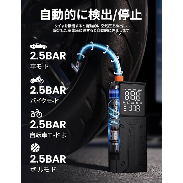 【多様な対応性:4種類のエアノズル】本製品には4種類のノズルが付属しており、様々な対象に使用することができます。さまざまなボール、浮き輪、自転車、バイクから自動車まで、この製品を使用して空気を入れることができ、非常に広範な実用性を備えている。自動車、バイク、自転車、ボールなどのモードを選択すると、手動で値を設定する必要がなく、システムが最適な充填圧力を自動で設定します。必要に応じて圧力を調整することも可能です。※異なるモデルの自転車バルブの内径が異なるため、実際の状況に応じて適切な内径を選択してください。