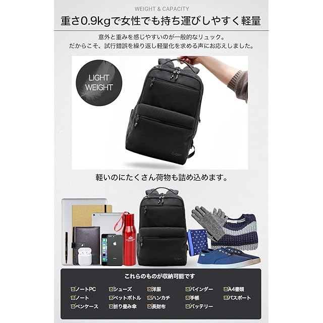[Evoon] マルチビジネスリュックair ビジネスリュック メンズ レディース 900g 軽量 撥水加工 リュックサック バックパック 人気 15.6インチ ブラック