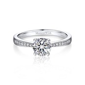 【エンゲージリング 】➣スターリングシルバーの婚約指輪 レディースには 6.5mm/1ctのモアッサナイトのセンターストーンがクラシカルな4本爪でセッティングされています。リングの細身のシャンクには16石のモアッサナイトダイヤモンド(4 x 1*1mm + 12 x 1.2*1.2mm small side stone)がリボンのように並び、センターストーンをより眩しく見せています。