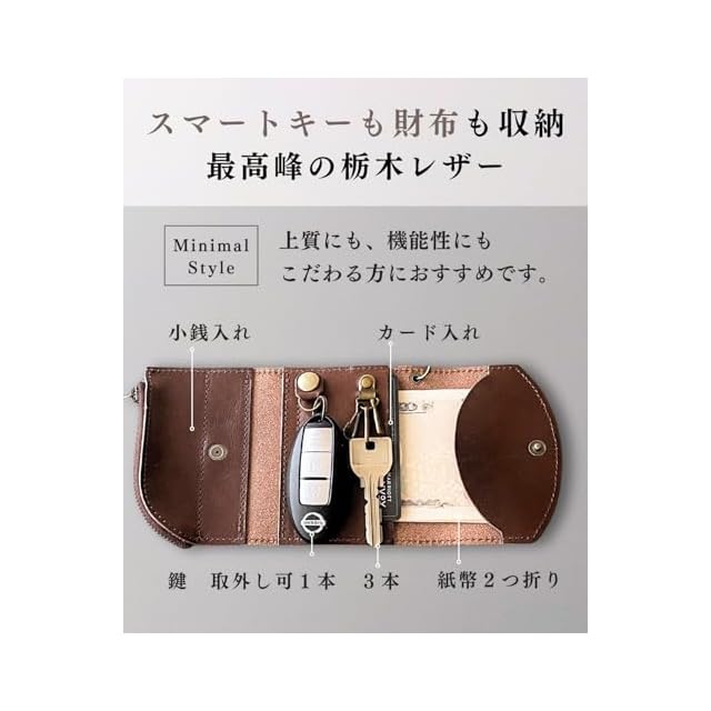 [iaji] キーケース スマートキー対応 小銭入れ 革 栃木レザー 日本製 スマートキーケース メンズ レディース (ブラウン)