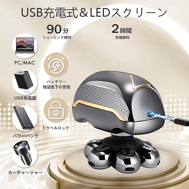 「USB急速充電とLEDディスプレイ」シェーバー メンズはUSB経由で急速充電できます。メンズシェーバーはわずか2時間でフル充電でき、最大90分間連続使用できます。ラップトップ、パワーバンク、車の充電器などを介してシェーバーを簡単に充電できます。