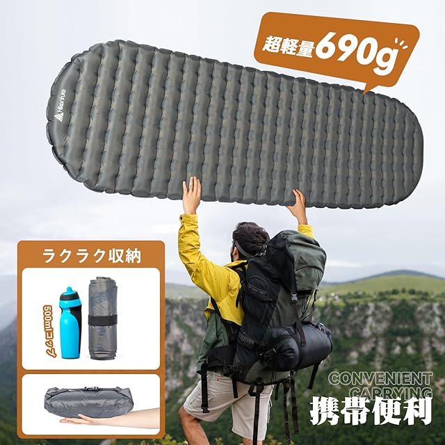 【590g超軽量●エアバッグ付】付属の収納袋はエアポンプに変えて呼気によってエアポンプ内に空気を吹き込み、2~3ポンプで短時間で簡単にキャンプマットを膨らませることができます。本体の重さは590gだけ、超軽量かつコンパクトで荷物にならない、軽さと快適性のどちらにも妥協したくないお客様のベストな選択肢です。