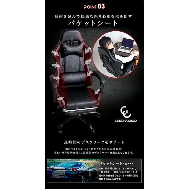 CYBER-GROUND ゲーミングチェア オフィスチェア デスクチェア フットレスト 170度 リクライニング バケットシート クッション ソフトレザー タンスのゲン 椅子 チェア ブラック 31510016 03(63951)