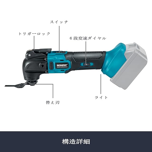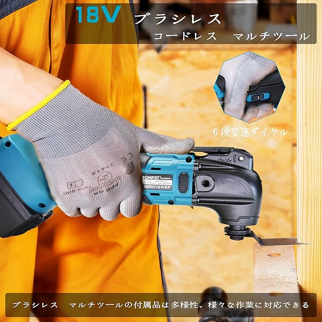 IRONFISTコードレスマルチツール、ブラシレスモータ電動振動ツール、PSE認証済、6段変速替刃、マルチ刃で切断、削り取り、研磨、18Vバッテリー電池にマッチング(バッテリー無し)