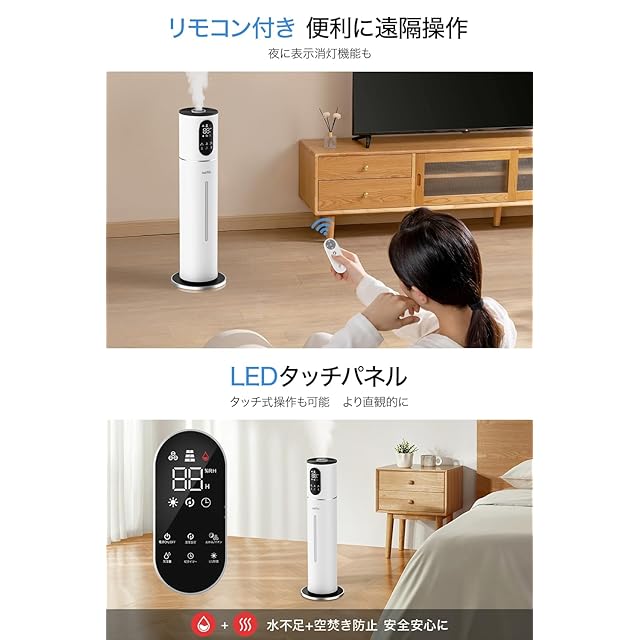 【湿度設定 タッチパネル&リモコン付き】ただ加湿するだけではなく、部屋の乾燥具合に応じてお好みの湿度を設定でき、設定湿度に達したら噴霧自動停止になる加湿器です。お部屋に程よい湿度を保つことで過加湿による結露やカビを防止し、健やかで快適な暮らしを送れます。また、タッチパネルを採用し、軽く触れるだけで電源オン/オフや運転モードを切り替えられます。もちろん、付属のリモコンでも操作可能、ソファやベッドの上でゆっくりくつろいだままでも遠隔操作できるのでさらに便利!