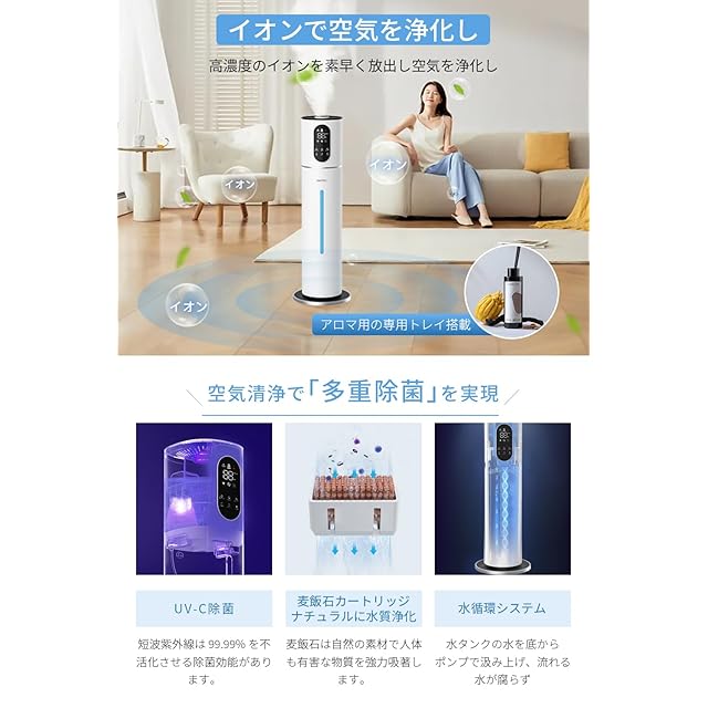 【多重除菌 空気清浄加湿器】吸い上げポンプで加湿器本体に繋がる水パイプを通して、下部のタンク内の水を汲み上げてくる仕組みとなっています。UVライトを搭載することによって本体内の水の雑菌を除菌してくれます。多孔質で雑菌を吸着除去する麦飯石に加えて、水の浄化をサポートします。水を汲み上げながらどんどん濾過される水循環システムなので流れる水は腐らず、嫌なニオイも防ぎます。さらに、きれいなミストとともにマイナスイオンを放出することも可能、お部屋の空気がリフレッシュされます。