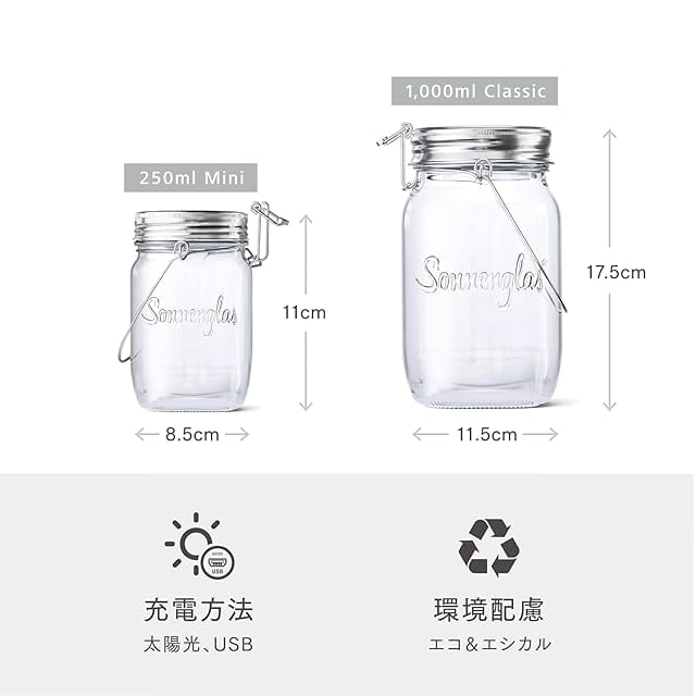 ソネングラは誰もが利用できる再生エネルギーである太陽光を、より手軽に、より美しく日常生活へ取り込むことを可能にするメイソンジャー型のソーラーランタンです。ドイツ発の最先端グリーン技術を搭載したソーラートップ ソ(蓋部分)で日中に太陽光で充電、夜には電球色の明かりを灯します。瓶はデコレーションが可能で、DIY感覚でご自身の世界観を表現できます。