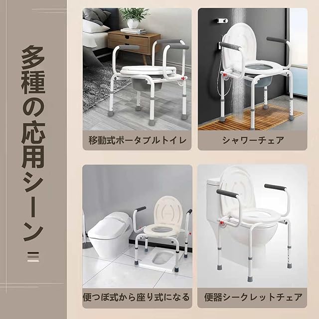 【高さ調節可能】椅子には5段階の高さが調節可能です。席の最低高さは(地面まで)36 cmで、最高高さは(地面まで)46 cmです。身長140 cmー190 cmの方達に対します。自宅便器の高さによって便器に取り付けて便器の手すりをとして使用こともできます。