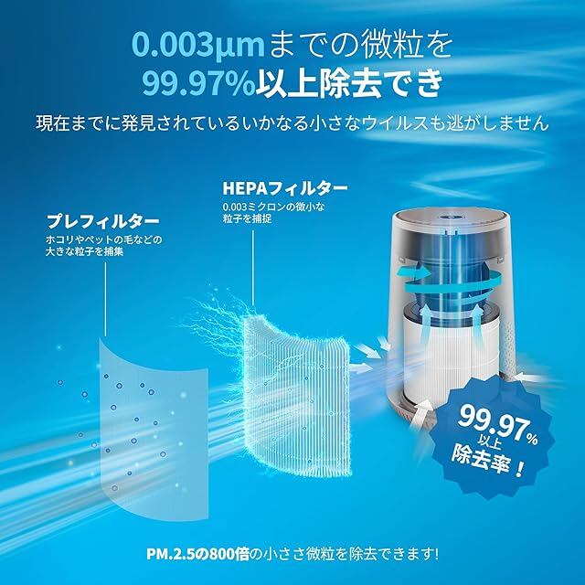 【空気の悩みから解放】:NanoProtect HEPA、プレフィルターを備えた2層フィルターにより、ホコリ、真菌、ウイルス、細菌、カビ、アレルゲン、花粉、PM2.5、ペットの毛など、あなたの悩みを解決します!プレフィルター層がほこりや動物の毛などの大きな粒子を捕捉でき、NanoProtect HEPA フィルターが微粒子やエアロゾルなど、0.003 μm程度の粒子は99.97%を捕捉できます。HEPA H13フィルターよりも早くにお部屋の空気を浄化し、快適な住空間を作り上げます。花粉やアレルゲンを抑制することで、くしゃみ、鼻水、鼻や肌のかゆみなどの症状を軽減する効果もあります。