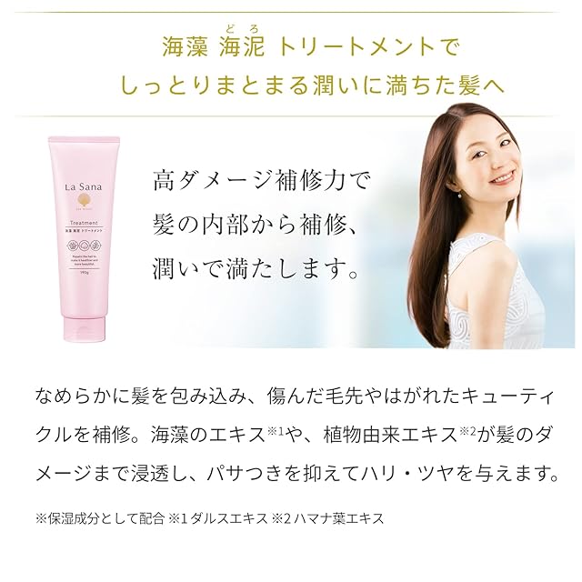 【海藻 海泥 トリートメント】ラサーナ独自の最適な配合バランスにて、鉱山由来のホワイトクレイと海底から採取した海泥を配合。髪にミネラルを補給します。髪の毛先から全体になじませた後、2~3分ほど置いてから頭皮にトリートメントが残らないようしっかり洗い流してください。