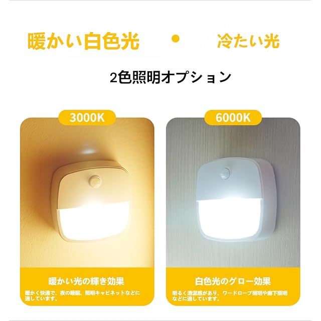 白光と暖光の即時切り替え可能:LEDセンサーナイトライトには二色調節機能があり、必要に応じて白光と暖光を切り替えることができます。これにより、様々な空間に適した照明が提供されます。人体の動きを検出できなかった場合、45秒後に自動的に消灯し、エネルギーを節約し、電池の寿命を延ばすことができます。