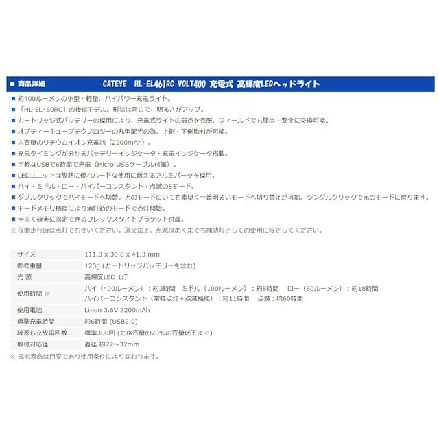 キャットアイ(CAT EYE) LEDヘッドライト VOLT400 HL-EL461RC USB充電式 front_left