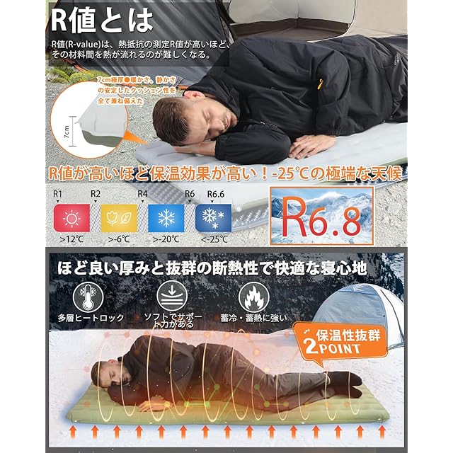 3 つの利点: ①専利特許を取得した内部構造と厚さ7cmのエアーマット、従来のインフレーターマットよりサポート力と断熱性が優れます。②専利特許を取得したスイッチ構造は、空気漏れを防止!②SGS認定6.8超高R値エアマットは、同じ価格で従来のエアマットよりR値が高くなります。