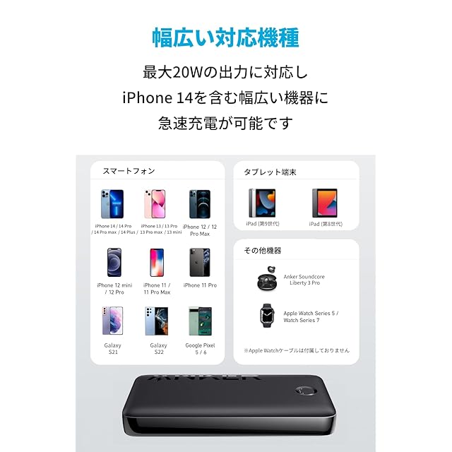 安心の超大容量:20000mAhの超大容量で、iPhone 14を約4回、Galaxy S22を約3回以上、満充電できます。緊急災害対策用としても最適です (※充電回数はAnker調べです) 。
