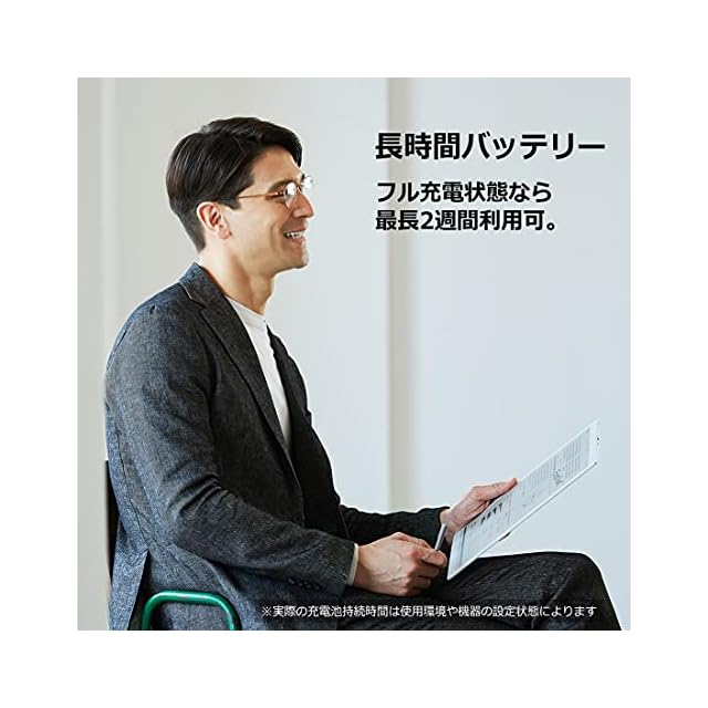 外形寸法(幅×高さ×奥行):約173.2mm×約242.5mm×約5.9mm / 質量(充電池含む):約261g / 駆動時間:Wi-Fi機能オフ時:最長2週間 / Wi-Fi機能オン時:最長5日