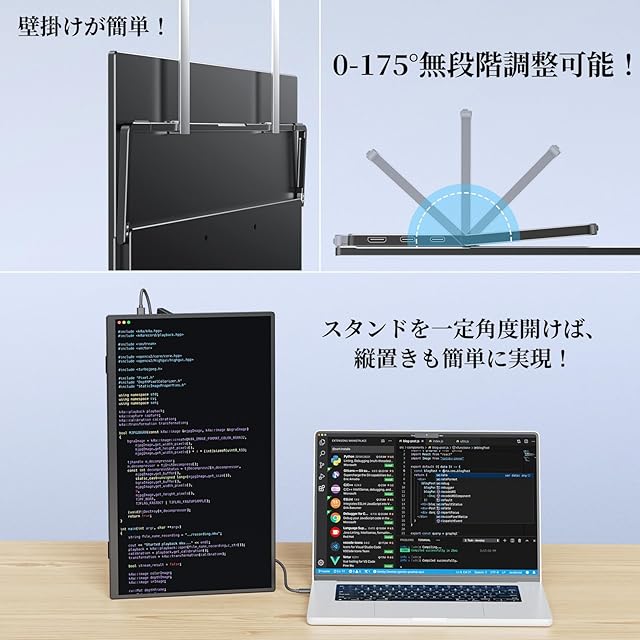 【自立スタンド付き・VESA対応】自立スタンド付きで、0°~175°の範囲内に自由調整可能!固定力十分だから、「大角度なら倒れるかも?」って心配もなく!そのうえ、底部の滑り止めゴムは四つも!自体はもう十分安定なのに、VESAまで対応可能!安定感重視ならまさにこの品一択しかないと言えるだろう!
