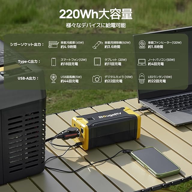BougeRV 220Wh 車載冷蔵庫バッテリー ポータブル電源 ACアダプター別売り モバイルバッテリー ポタ電 シガーソケット USB出力 Type-C出力/入力 小型 軽量 コンパクト リチウムイオン電池 AC/DC/Type-C/ソーラー充電 4Way充電方法 電圧安定 LEDライト付き 長寿命 高耐久 車中泊 キャンプ アウトドア 停電時 災害時 停電対策 防災グッズ PSE認証済