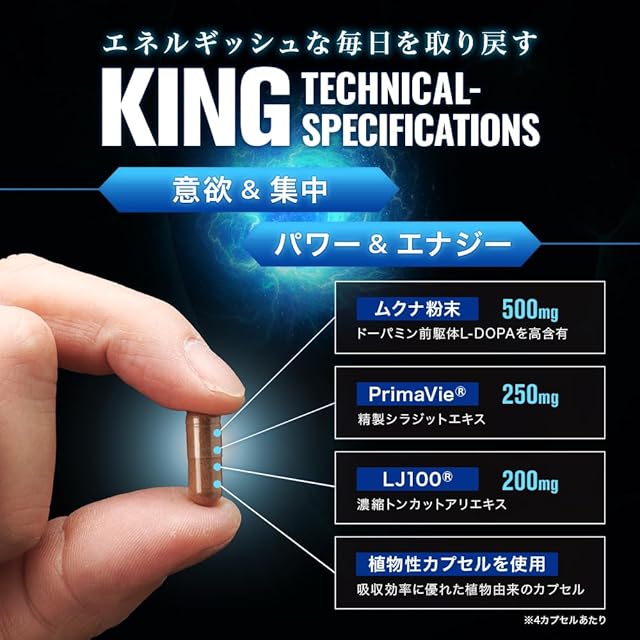 【かつてのエナジーブーストを求める方へ】以前のように思ったようなカラダづくりができない、仕事にのめりこむことができない、なんとなく毎日の調子が上がらない、などネガティブな状況に陥りやすくなってきたという方のためにHALEOが開発したのが「KING」だ。世の中で"KING”と呼ばれるにふさわしい成功をおさめている男性は、年月を重ねても自身のパワーを高めるようなライフスタイルを実践している。HALEOのKINGは栄養面からその理想的なコンディションの実現をサポートする。KINGの豊富なエビデンスを有する3種の古代植物由来成分がカラダづくりからビジネス、日常生活に至るまでパワフルそして意欲的に取り組むための強力な味方となってくれるだろう。