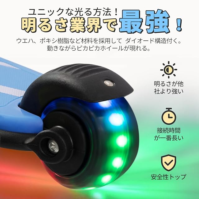 「最強の光るホイールに搭載する」ウエハ、銀ゴム、エポキシ樹脂など素材を採用し、電池なくても光る事ができます。光る効果が業界で一番です。くらい場所でも子供の姿がはっきり見えます。