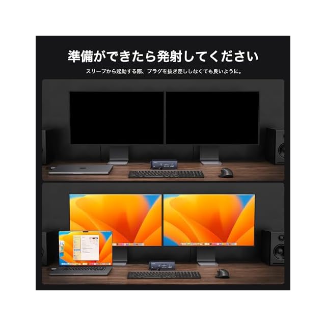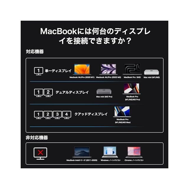 【Quad 6K@60Hzディスプレイ】2021/2023年製のM1/M2/M3 Maxチップ搭載のMacBook Proシリーズのみがクアッド拡張ディスプレイをサポートしています。2021/2023年製のM1/M2/M3 Proチップ搭載のMacBook Proシリーズはデュアル6K@60Hzディスプレイのみをサポートしています。2020/2022年製のM1/M2/M3チップ搭載のMacシリーズは単一の6K@60Hz拡張ディスプレイのみをサポートしています。注意: このドッキングステーションはWindowsラップトップと互換性がありません。