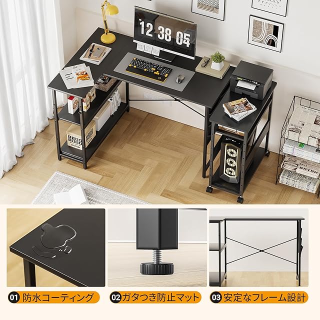 Alebert デスク 机 L字デスク パソコンデスク「メーカー一年保証」 幅107cm 机 pcデスク 勉強机 テーブル 作業机 ゲーミングデスク ラック付きデスク l字型デスク ワークデスク オフィスデスク コーナーデスク ゲームデスク 棚板高さ調節可能 省スペース (ブラック)