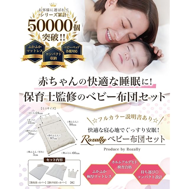 【保育士が監修】 Rozally ベビー布団セット がついに正式販売開始。 「ふかふかな寝心地のベビー布団が欲しい…」というお客様の声から生まれた 「枕」「掛け布団」「敷き布団」「マット」「シーツ」 が1つになったベビー用布団セットです。コンパクトに収納にして 持ち運び 可能な点も人気の1つです。 幼稚園や保育園のお昼寝で必要になる入園アイテムとしても購入頂いております。 企画&設計では 新生児 や 乳幼児 など 子供 の育児に詳しい【保育士】の先生からアドバイスをもらい、衛生的に使えるよう丸洗い可能な素材選定を行いました。 シンプルで可愛いデザインに仕上げたため出産準備や出産祝いなどギフトにも最適になっています。