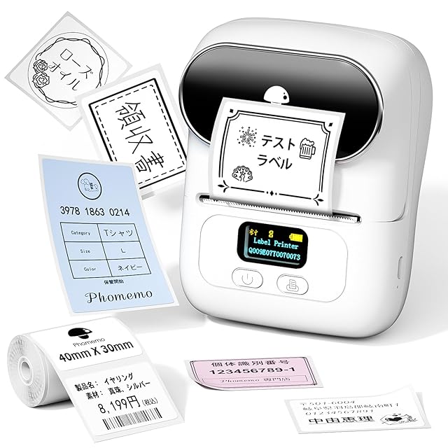 ラベルプリンター Pesuza M110 スマホ PC対応 宛名ラベルプリンター ラベルライター シールプリンター バーコードプリンタ スマホプリンター 値札プリンター ラベルメーカー 中小企業用プリンター Bluetooth接続 領収書 冷蔵庫収納 食品表示 名前 アドレス 郵便宛名 梱包発送 Android/IOS適応 幅20-50mm 黒文字 連続印刷 充電式 ホワイト 40x30ラベル付き