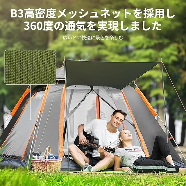 【2025年最新超広い空間と優れた視界】binoa ワンタッチテントは、4.4平方メートルの広さを持ち、210mm*210mm*150mmのサイズで、3~4人が快適に過ごせるように設計されております。前庭と大きい天窓があり、全方位で超絶の視界を楽しめます。