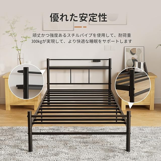 Alebert ベッドフレーム シングル パイプベッド 【メーカー一年保証】収納棚付き シングルベッド 耐荷重300KG ベッドフレーム シングル コンセント付き スチールベッド ベッド下収納 防錆 頑丈 安定性 耐久性 組み立て簡単 (ブラック, シングル)