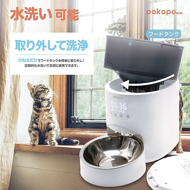 [イツワペット] Pokopo 自動給餌器 自動餌やり器 餌やり機 犬 猫 録音機能 USB電源 乾電池 単一電池 2WAY給電 水洗い可能 スケジュール登録 タンク容量3.5L 最小設定5g 40段階設定可能