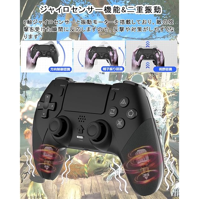 【様々な機能を搭載】連射機能、二重振動、タッチパッド、LEDライト、イヤホンジャック,様々な機能がサポート。6軸ジャイロセンサーと振動モーターを搭載しており、敵の攻撃を受けた瞬間に反応しますので、反撃や対策がしやすくなります。より精密な動きが実現できるように可能となりました。さらに、3.5mmイヤホンジャックが設けており、ヘッドセットを着用するとゲームに感動的な臨場感を与えてくれます。注:接続できない場合は、コントローラーの背面に2mmの小さな穴(リセットキー)があります。針や小さなもので押してください、接続できない問題が解決します。