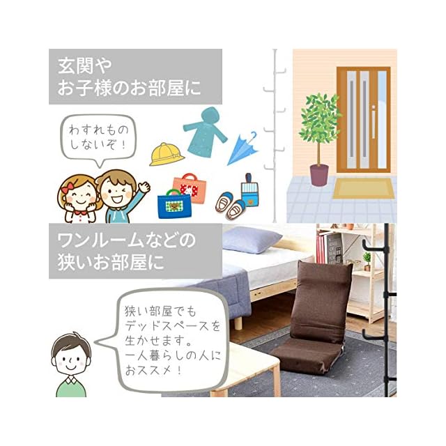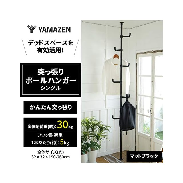 山善(YAMAZEN) 突っ張り ラック ポールハンガー 全体耐荷重30kg ワンタッチ突っ張り (実用新案取得済) 高さ190-260cm コートハンガー 玄関収納 一人暮らし 子供部屋 組立品 マットブラック WJ-725RM(MBK) シングル