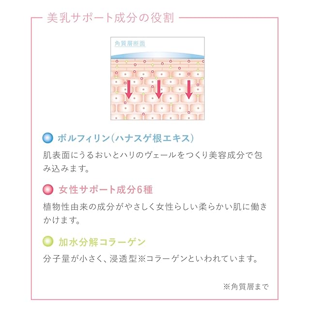 ❷バストケア成分ボルフィリン※2(肌のハリ・弾力UP成分)をはじめ、透明感、うるおいを与える成分を配合。