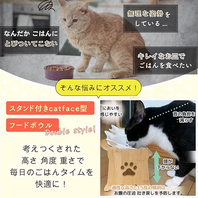 cat mom 組み立て不要 猫 陶器 食器 スタンド付 ダブル 餌入 食べやすい フードボウル 猫用 犬用 高さ調節 傾斜 食器台 餌台 すぐ使える ミルク色(ホワイト)