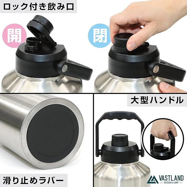 【水筒としても使用可能】ピクニックやスポーツなどの水分補給が必要なシーンでは、大型の水筒としても活躍します。(保冷専用)【その他の機能】「ロック付きの飲み口」や「滑り止めラバー」「大型ハンドル」など、使いやすさを考慮した機能が携わっています