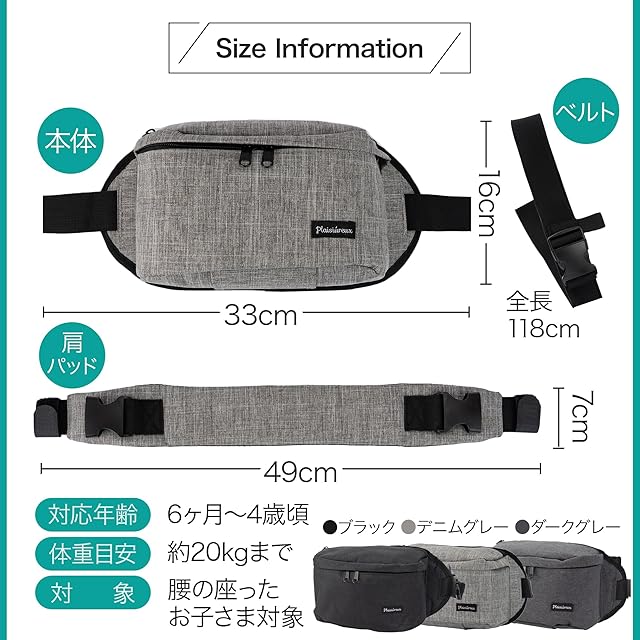 【商品仕様】○サイズ:バッグ部分横33cm×縦16cm×マチ10cm、肩パッド横49cm×幅7cm×厚み1.5cm、ウエストベルト全長118cm ○対応年齢:6ヶ月~4歳頃 ○耐荷量:約20kg ○素材:ポリエステル ○カラー:ブラック、デニムグレー ○ご注意:安全のため、腰サポートクロス使用、未使用に関わらず、必ずお子様を片手で支えてご使用ください ○ブランド:Plaisiureux(プレジュール)