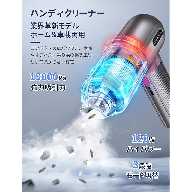 【スリムなのにハイパワー】 ハンディクリーナーには、高速モーターが搭載され、最高13000Paパワフルな吸引力が生まれます。3段階吸引力モードが切り替えます。120W 車用掃除機 はペットの毛、花粉、ダニ、ゴミ、髪の毛、ほこりなどの小さな粒子を簡単に吸入でき、ソファーの隅であれ、カーシートの隙間であれ、快適に清潔な環境を実現できます。