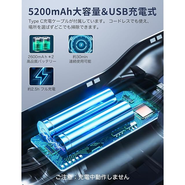 【5200mAh大容量&USB充電式】 大容量リチウムバッテリーが内蔵され、約2.5時間充電完了、30分間継続的に使用可能です。Type-C USB充電式でさまざまな電源に適合し、 USB直接充電、シガーソケット充電、モバイル電源などを使用できます。ハンディ掃除機 にLEDランプが搭載されて、暗い隅のゴミやホコリでもはっきりと見え、自宅の掃除をより簡単にすることができます。