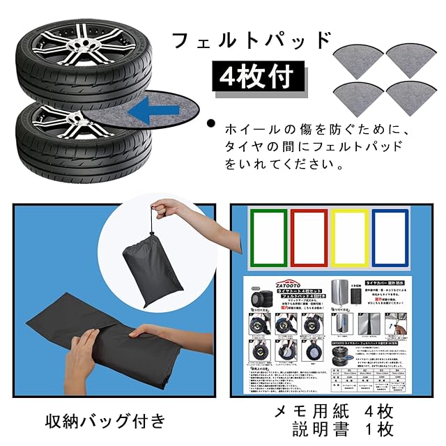 ZATOOTO タイヤカバー 屋外 フェルトパッド4枚付き タイヤ 4本 収納 保管カバー 420D 厚手 防水 紫外線 劣化 汚れ防止 防犯 耐久 SUV用 収納袋付き (15/16/17/18/19インチ) ブラック LYLTZ04-B