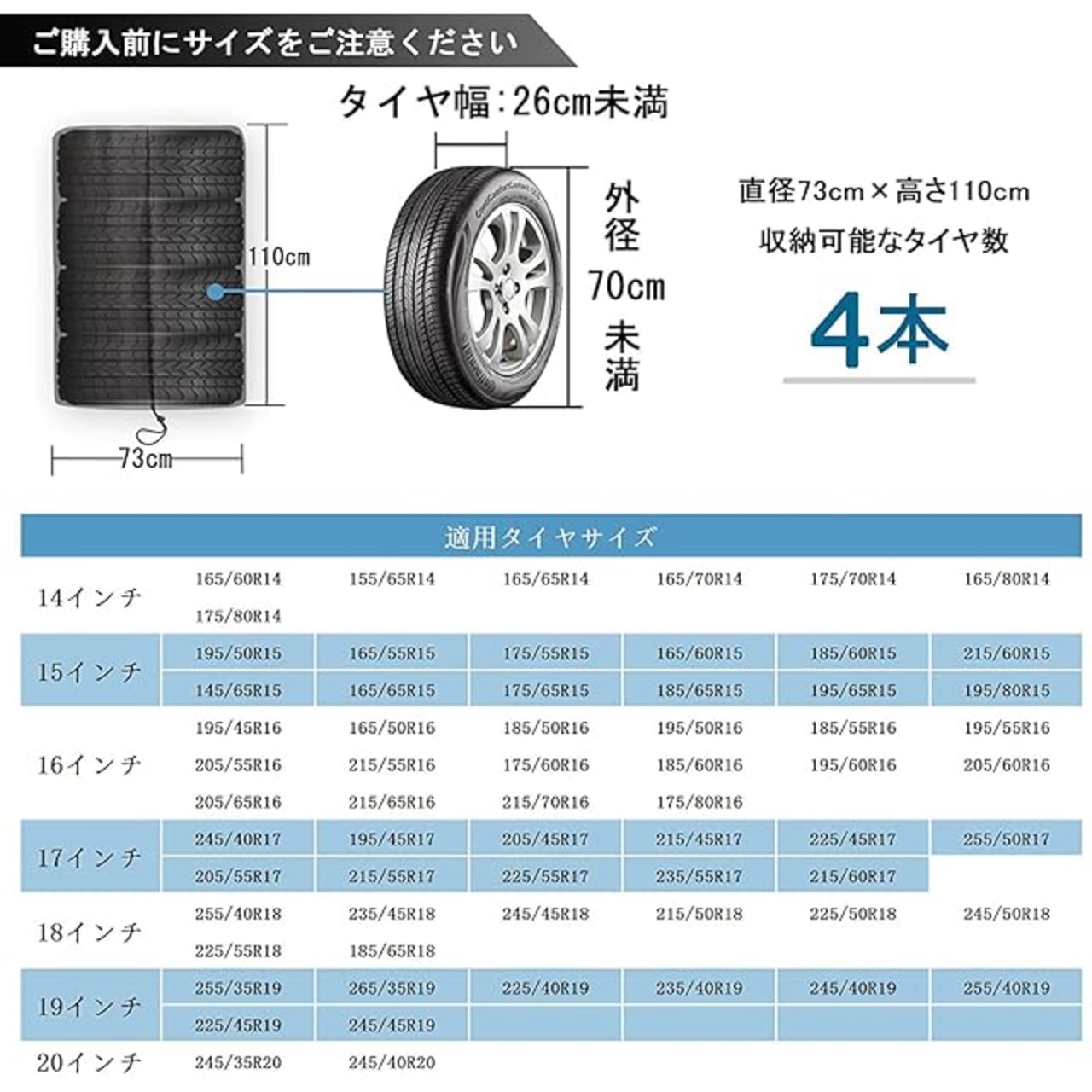 【収納バッグ付き】タイヤカバー直径70cm*高さ100cm、外径68cm未満のタイヤ4本を収納可能。収納バッグ付き、使わない時、収納袋に入れて、コンパクトで持ち運び安くて、スペースもとらないです