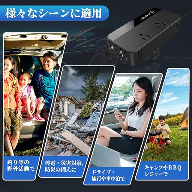 【防災と緊急対策】この インバーター 12v 100v はQC3.0急速充電に対応しますので、電気用品を短時間でフル充電できます。台風や地震が来る時に電源の確保においてもご安心。車のあるご家庭には常備しておくことをオススメします。車中泊、キャンプなどのアウトドアでも活躍している 車 インバーター です。