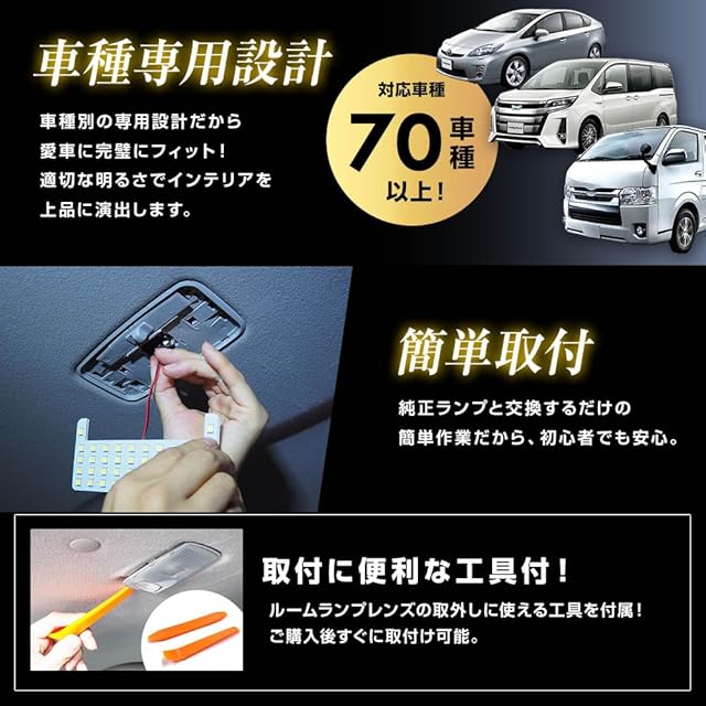 【専用工具付きで簡単交換】車体側のルームランプレンズを取り外すための専用工具(内張り剥がし)が付属しているため、取り外しづらいランプレンズも簡単に取ることができ、純正ランプと交換するだけの楽々交換。作業時間も短縮し、LED初心者さんをしっかりサポートします。