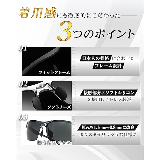 [LUCIAL] 超偏光 × 極薄レンズモデル 運転用 スポーツサングラス UV400カット仕様 釣り ランニング ゴルフ [アルミ合金採用 わずか25gで高耐久性] (クールブラック)